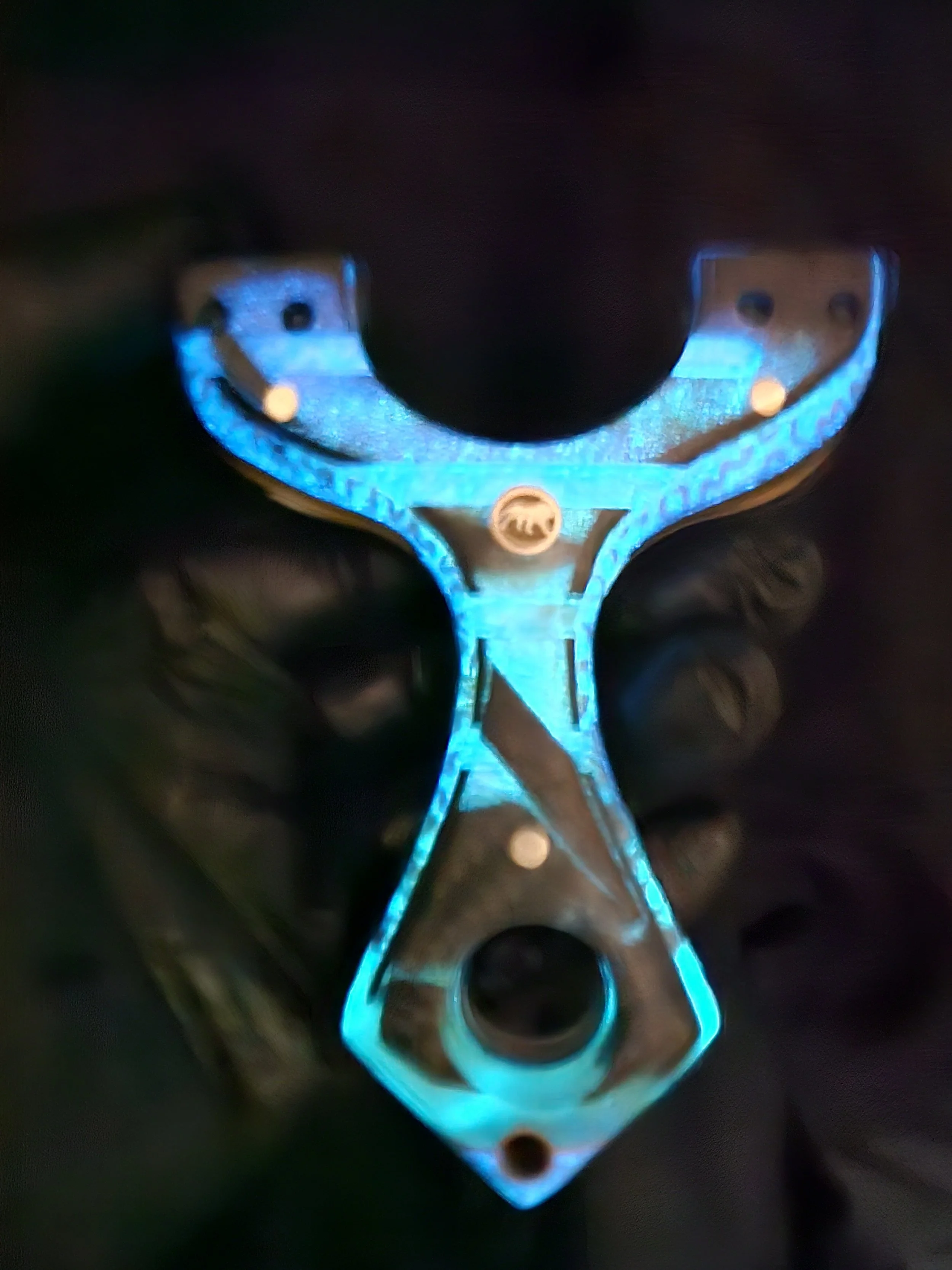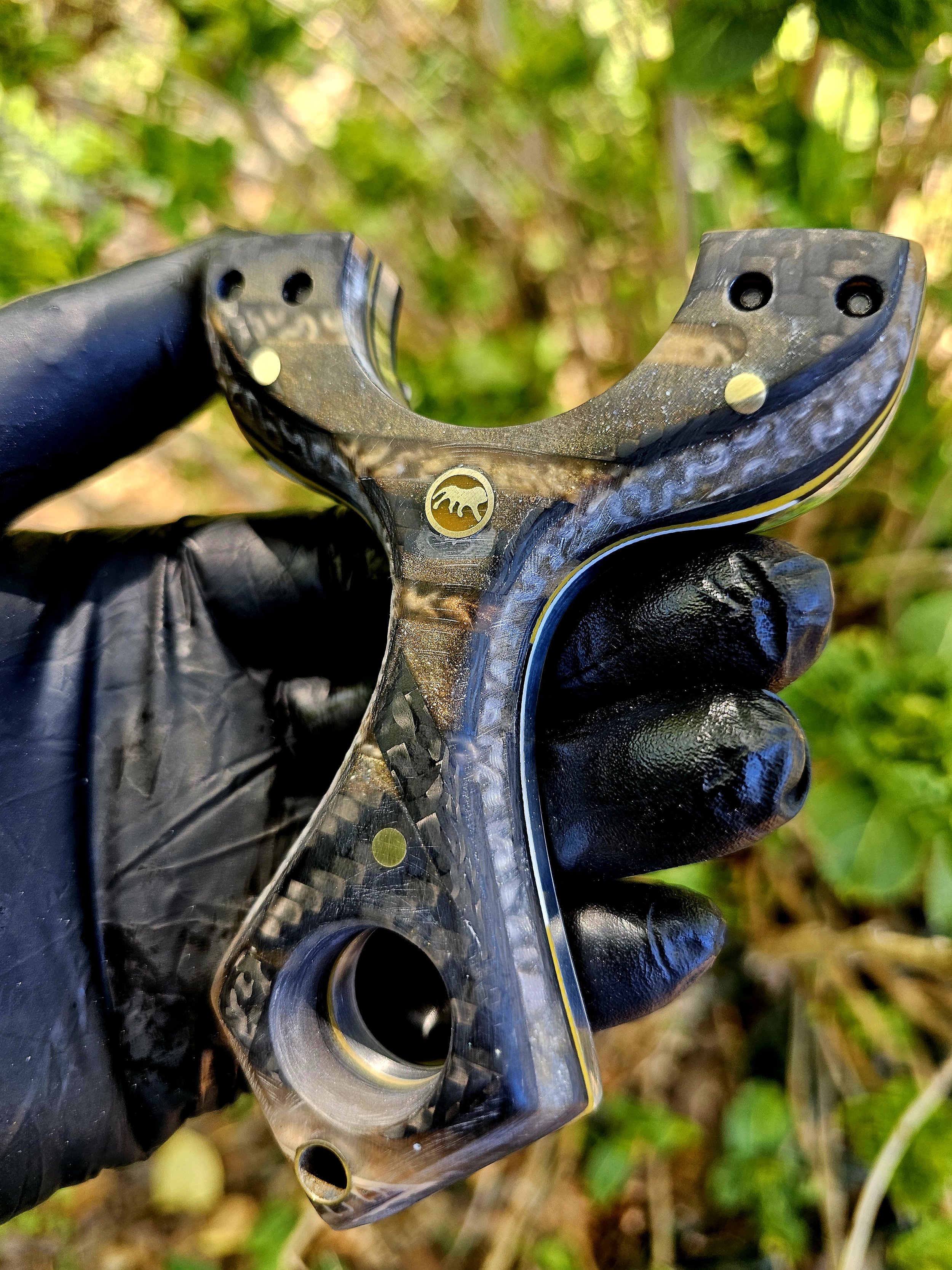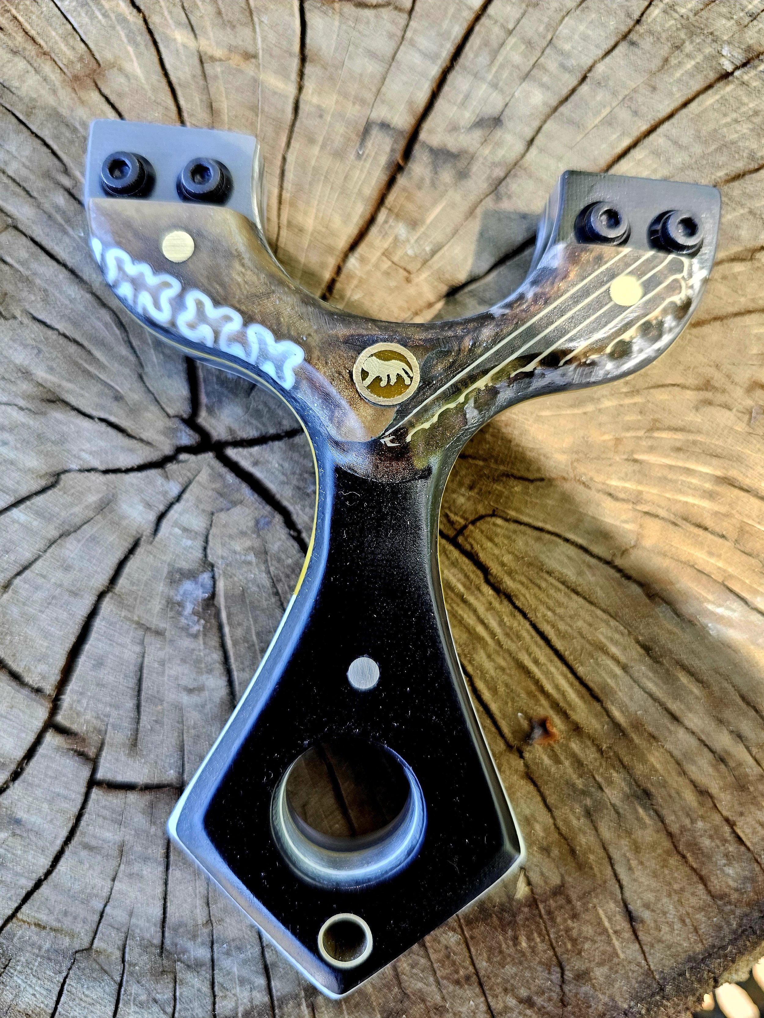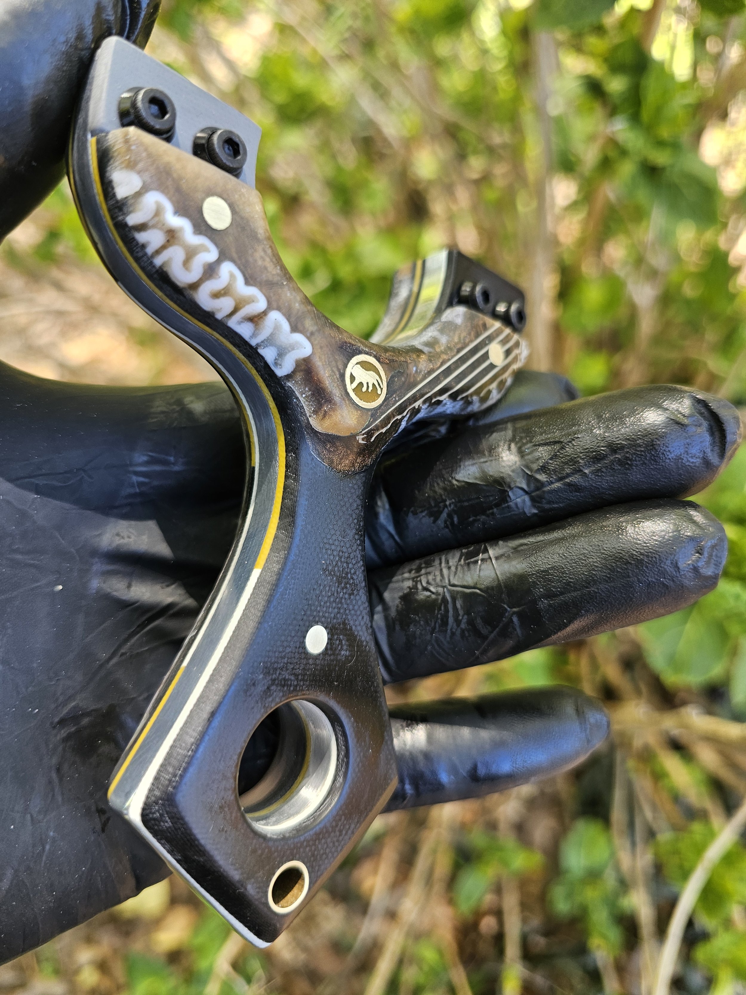 Aluminum core, g10 layers and splits. Hybrid glow resins with carbon fiber , poly and synthetics. Held by brass and mosaic pins.