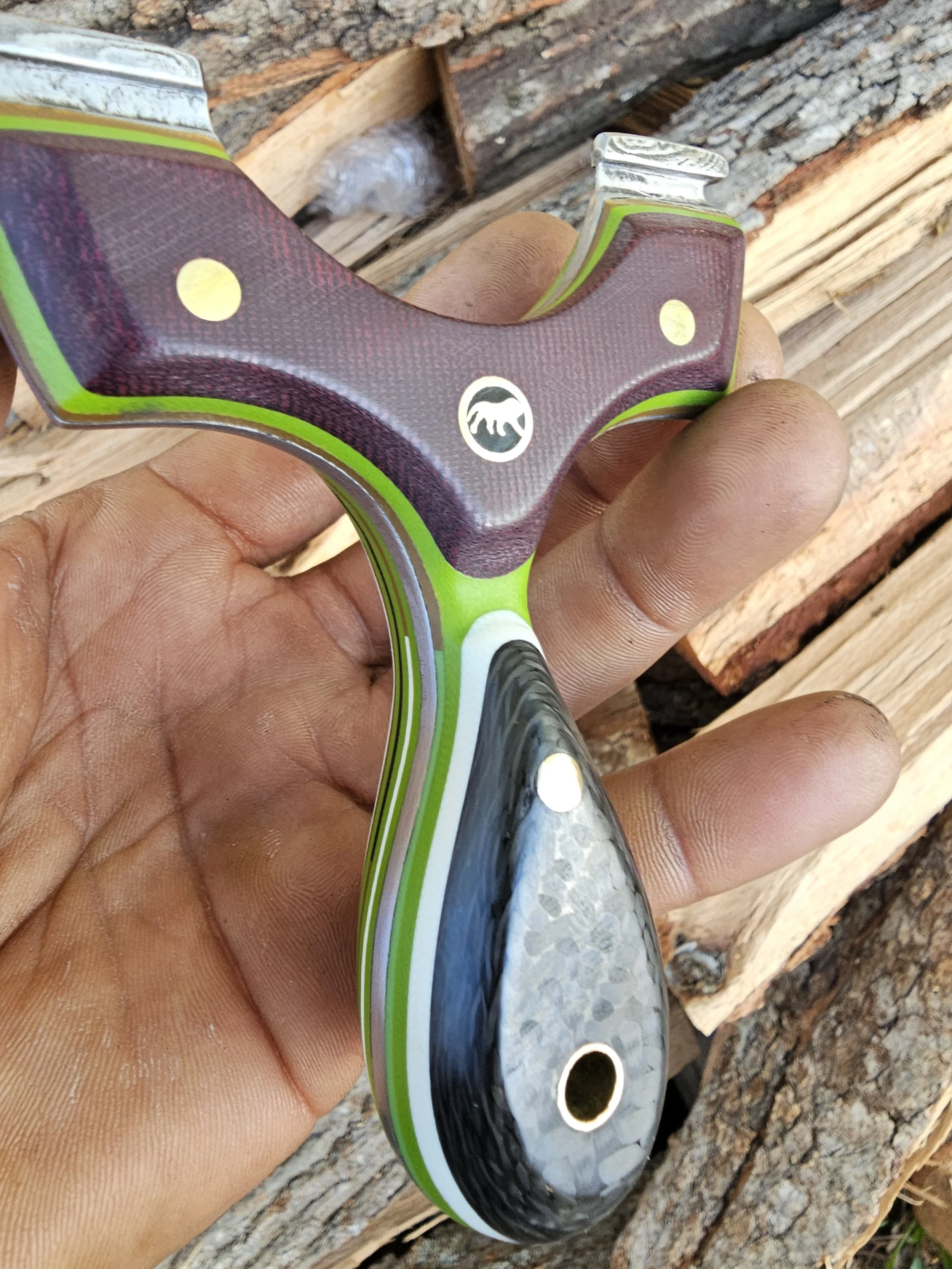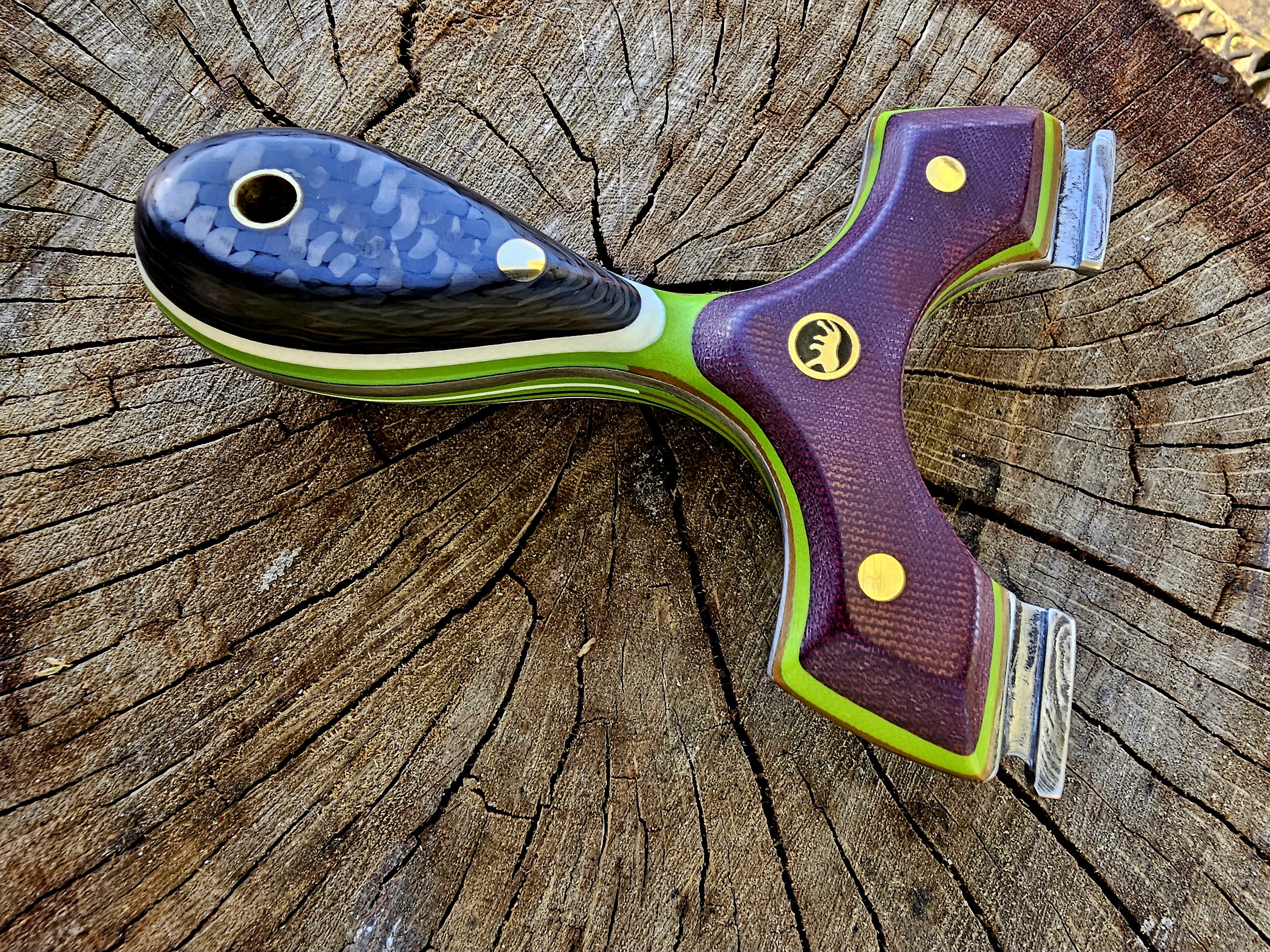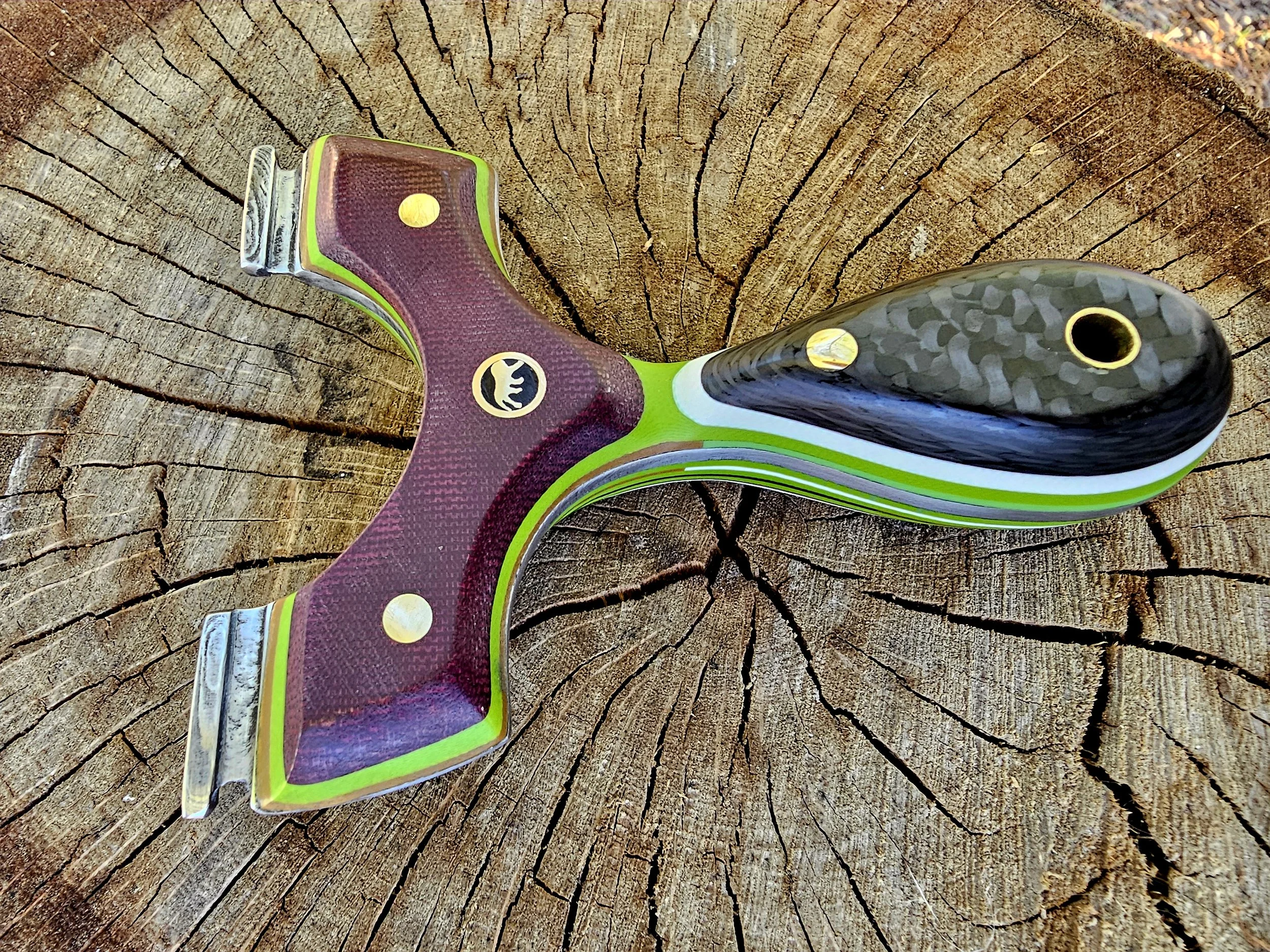 Shop Now › Lions Paw v2 90mm Robinhood Image 1 of 8 Image 2 of 8 Image 3 of 8 Image 4 of 8 Image 5 of 8 Image 6 of 8 Image 7 of 8 Image 8 of 8 Lions Paw v2 90mm Robinhood $325.00 Damascus core, carbon fiber, double red canvas, multilayered g10 split liners and inlays. Held by brass and mosaic. Purchase Added! Damascus core, carbon fiber, double red canvas, multilayered g10 split liners and inlays. Held by brass and mosaic.