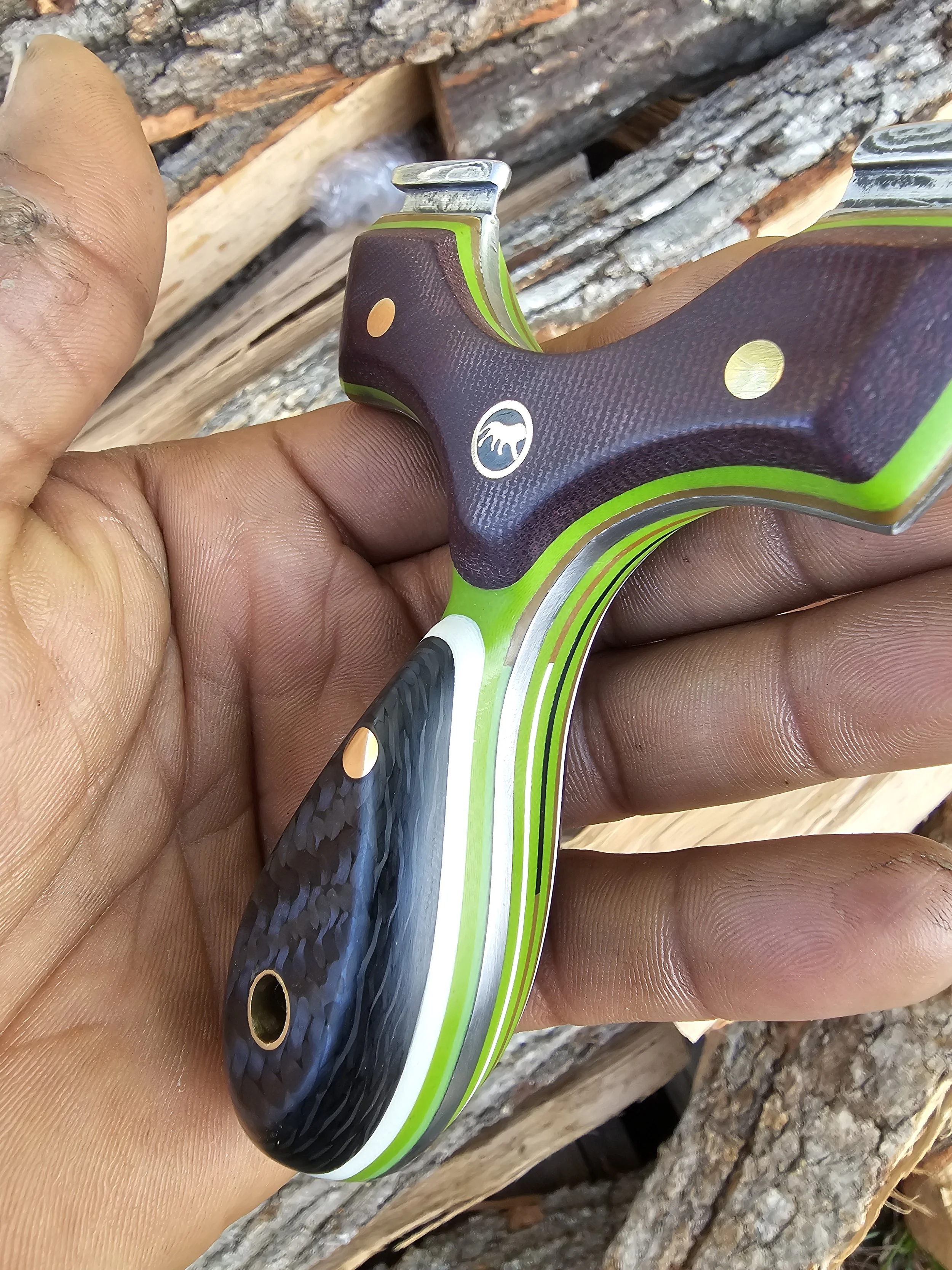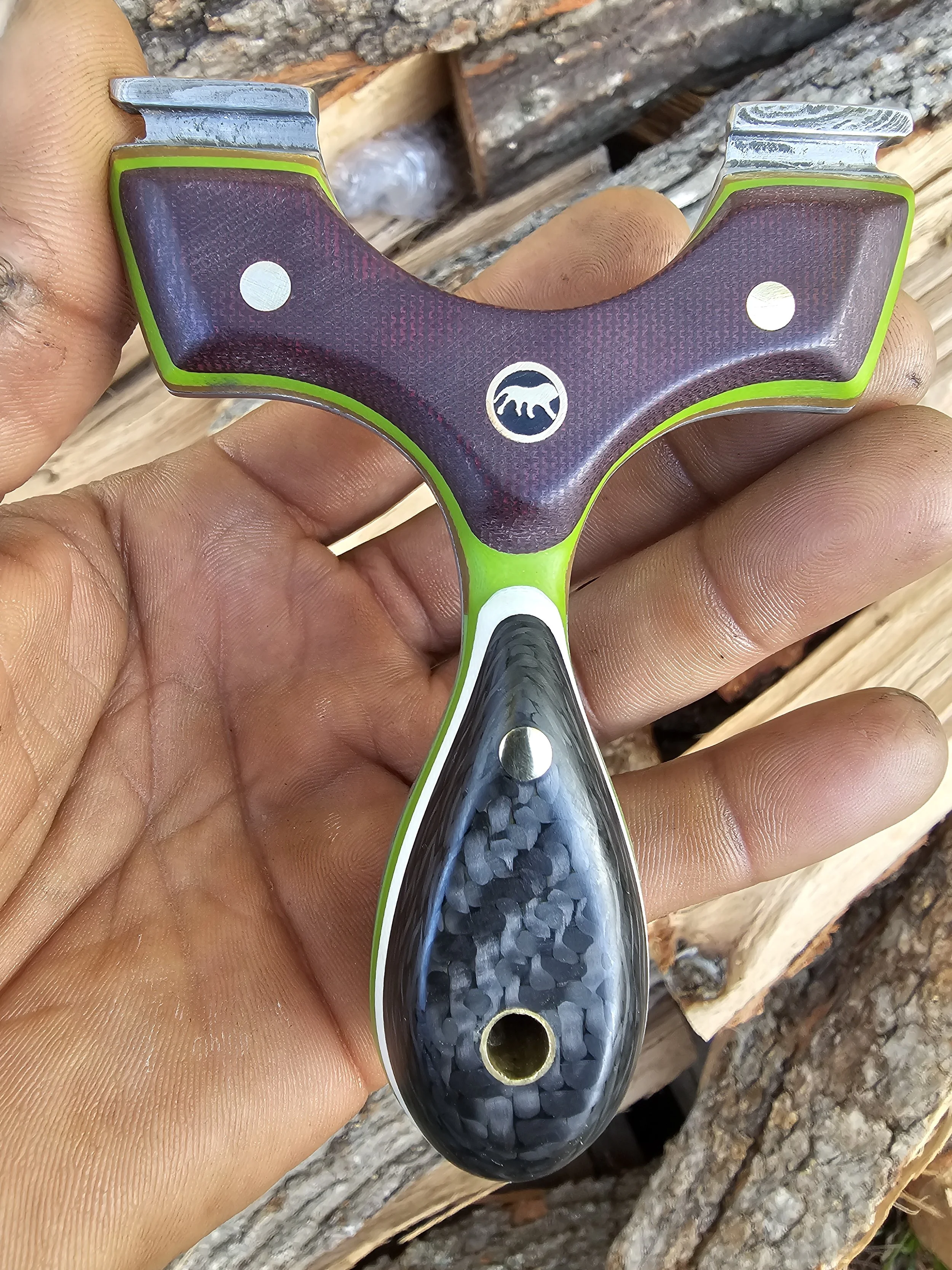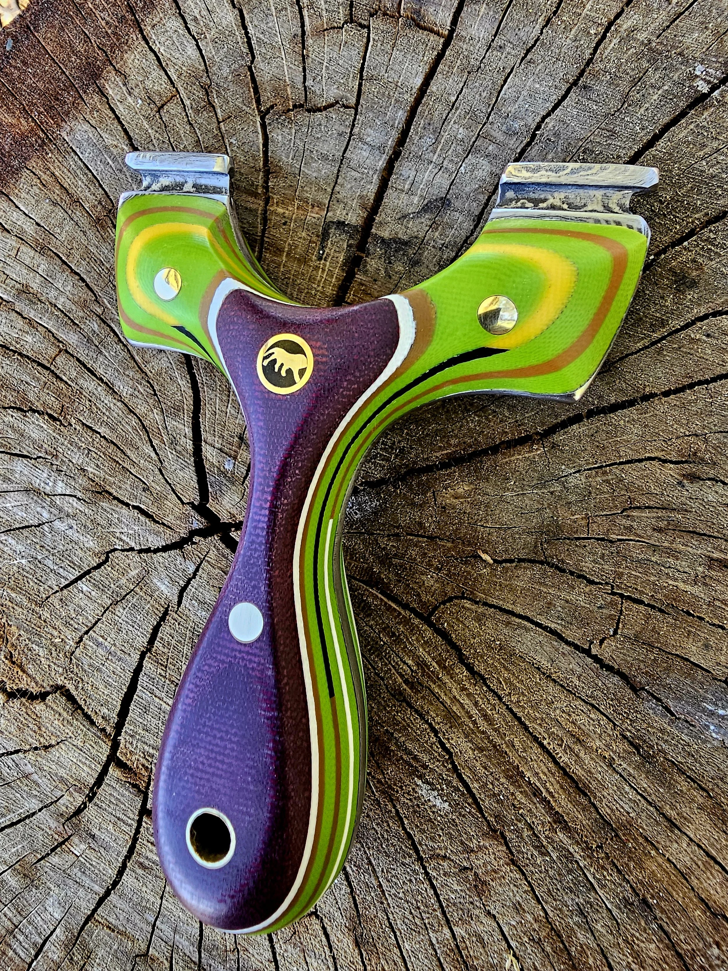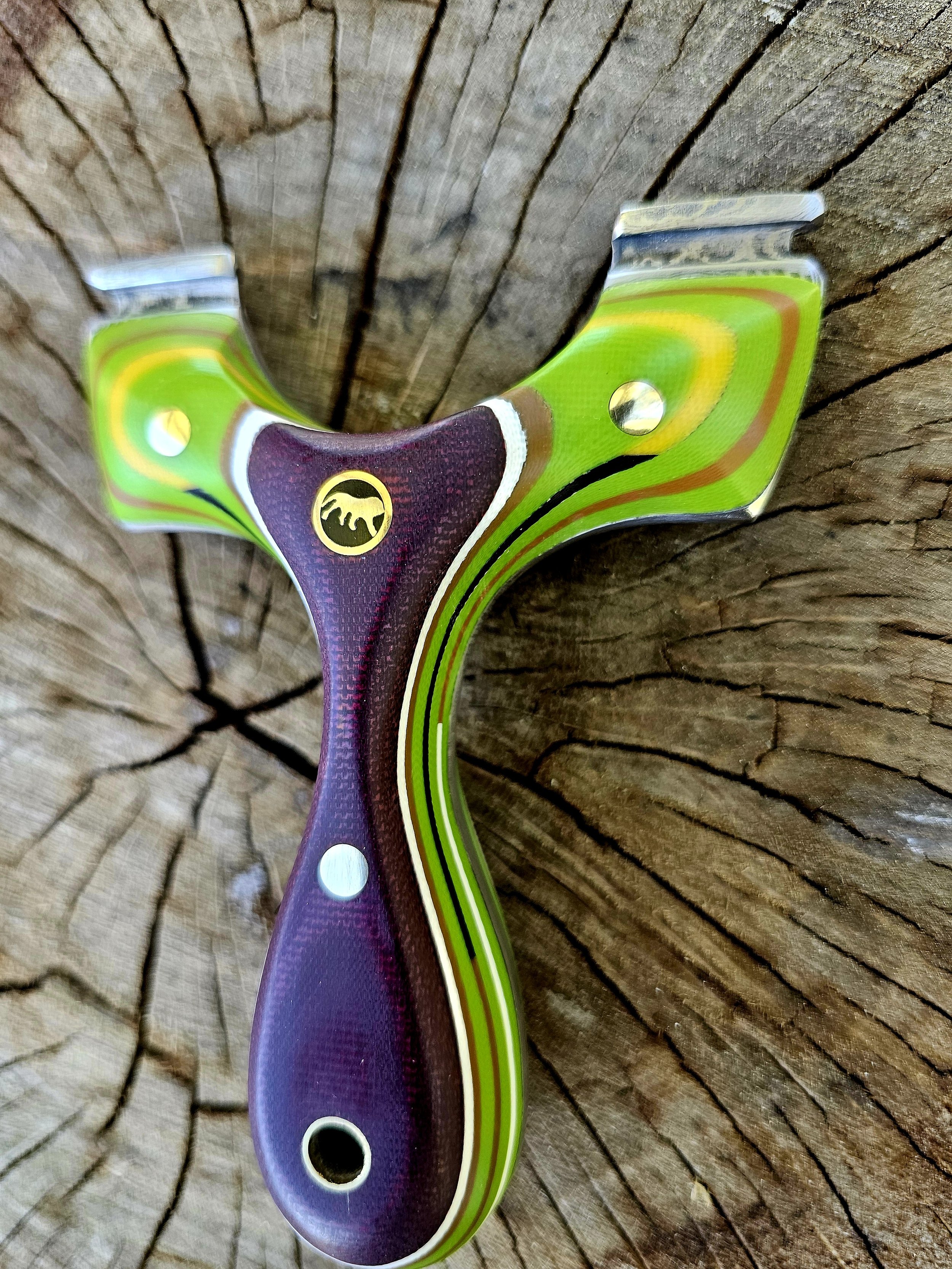 Shop Now › Lions Paw v2 90mm Robinhood Image 1 of 8 Image 2 of 8 Image 3 of 8 Image 4 of 8 Image 5 of 8 Image 6 of 8 Image 7 of 8 Image 8 of 8 Lions Paw v2 90mm Robinhood $325.00 Damascus core, carbon fiber, double red canvas, multilayered g10 split liners and inlays. Held by brass and mosaic. Purchase Added! Damascus core, carbon fiber, double red canvas, multilayered g10 split liners and inlays. Held by brass and mosaic.